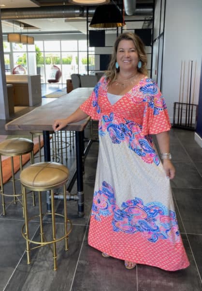 Unlike many of the Lilly Pulitzer Maxi dresses, this is an engineered fit, meaning it has a zipper and doesn’t just slip over the top of your head. It is long and flowy (I did have to hem it a bit), but otherwise fits true to size (I’m wearing a size 14).